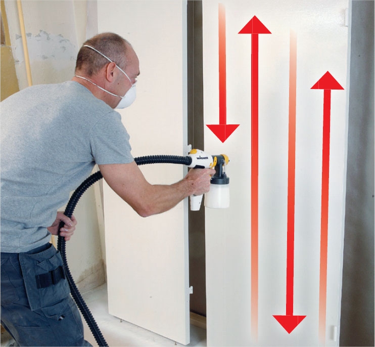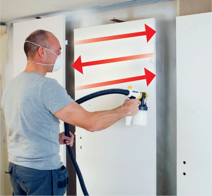 Sprøjtepistolen skal ikke svinges og vippes op og ned, men holdes vandret og med retningen mod samme “verdenshjørne” hele tiden, mens du uden at standse op fører den i enten lodrette eller vandrette baner hen forbi fladen, hele tiden i samme afstand. På den måde, og kun på den måde, lægger du et ganske tyndt, ensartet lag over hele fladen.