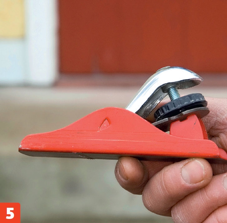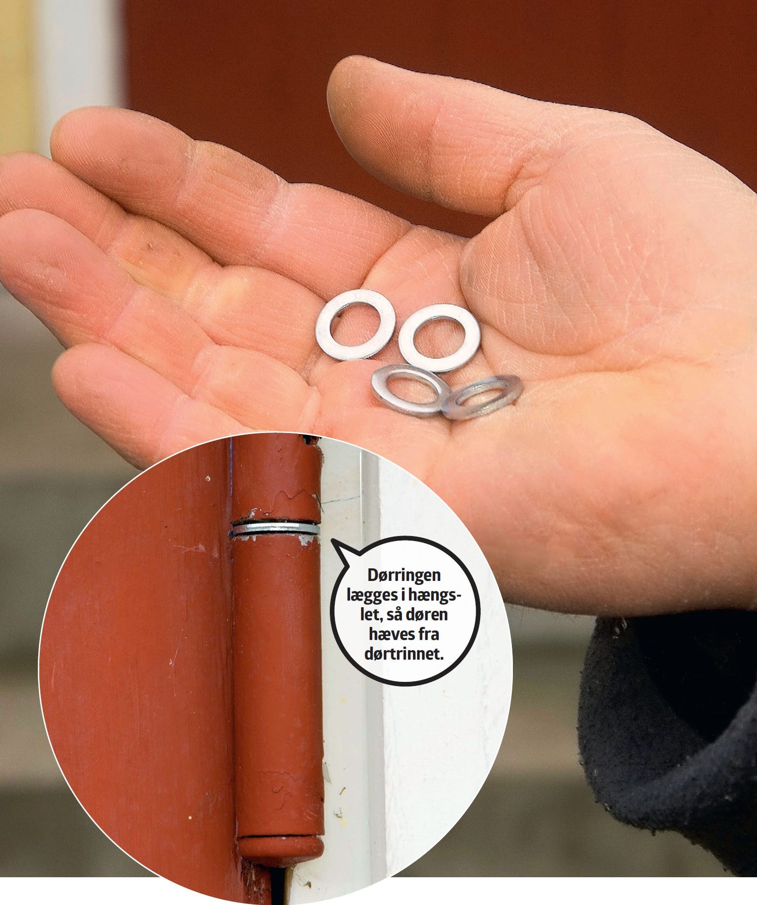 Løft døren af, og sæt dørringe i alle hængsler. Sæt døren på plads igen. Dørringene hæver døren, så den ikke går mod dørtrinnet. Ringene findes i forskellige diametre og tykkelser. Mål diameteren, inden du køber ringene.