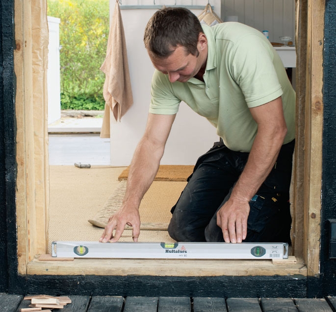 Klods op til bundstykket, så det er i vater, når rammen sættes i. Kan dit vaterpas ikke nå i hele bredden, kan du lægge det på et lige stykke træ, som er langt nok til at nå fra mur til mur.