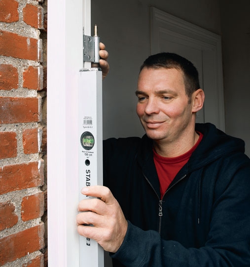 Sæt hængselsiden af karmen i lod. Du bruger klodser eller kiler rundt om karmen, og det er en god idé at give dem en dykker, så de bliver siddende.