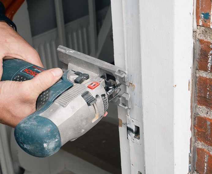 Skær karmen ud med en stiksav eller en fukssvans. Skærer du lidt skråt oppefra, er det nemt at vippe den overskårne karm ud.