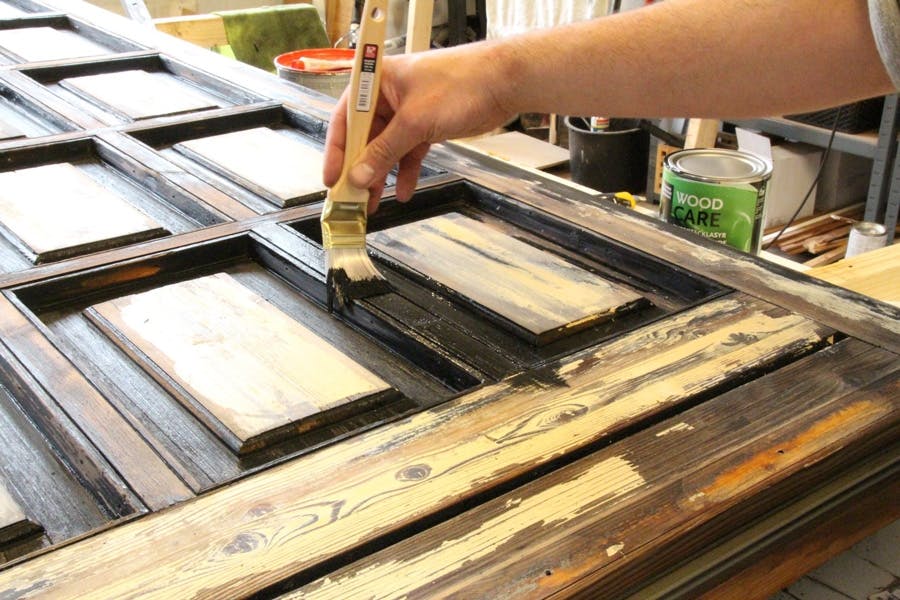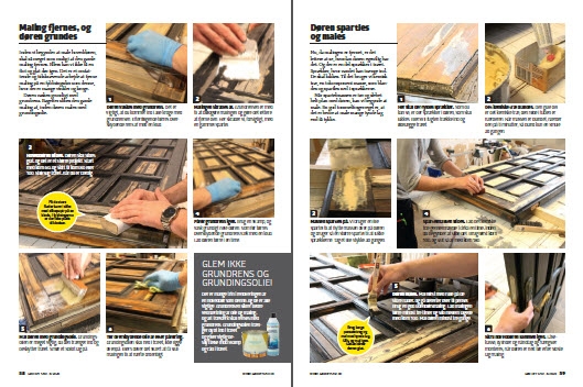 Døren vaskes grundigt med grundrens. Bagefter slibes den gamle maling af, inden døren males med grundingsolie.