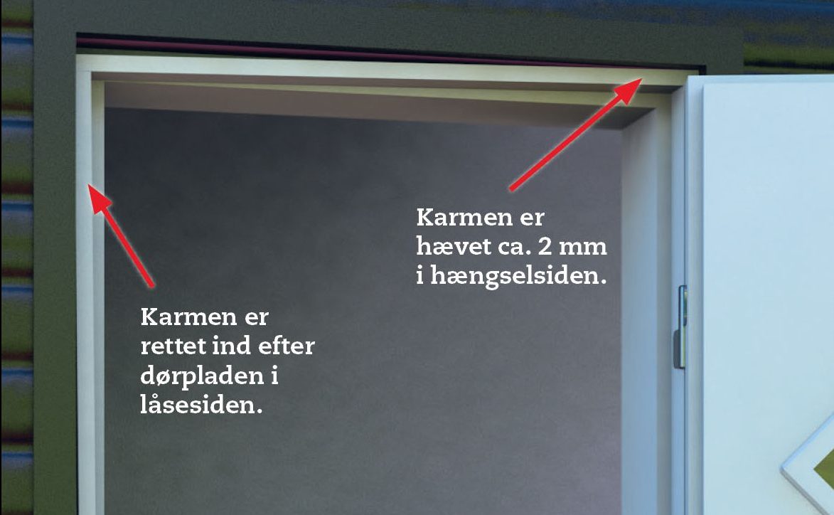 Dørpladen (altså selve døren) vil ofte være en lille smule skæv. Sætter du karmens hængselside i lod, vil afstanden mellem den lukkede dør og karmen blive uens. Men retter du karmen ind efter den let skæve dørplade, ja så fordeles afstanden ens, og det hele ser lige ud.