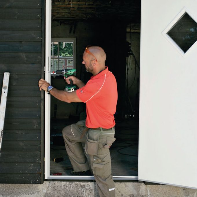 Du får brug for en hånd, når døren skal løftes på plads. En facadedør er tung, og der er ingen grund til at risikere hverken den dyre dør eller dit helbred, så praj lige naboen, eller inviter en stærk ven. Ham får du også brug for lidt senere i processen.