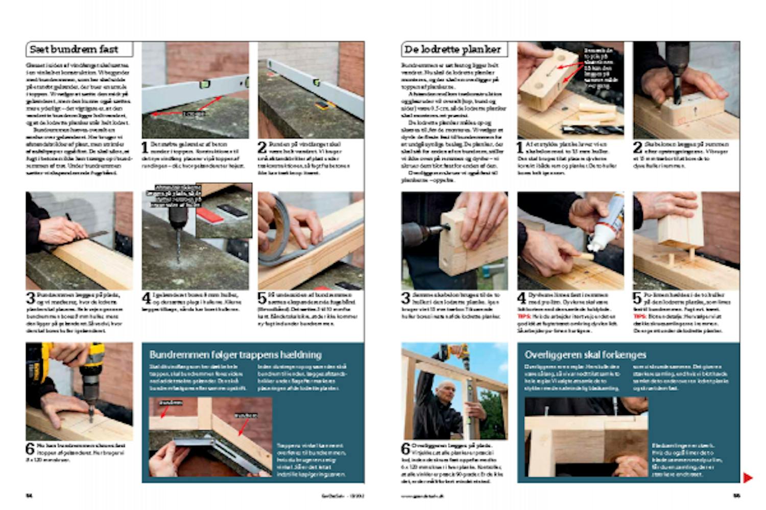 I gelænderet bores 8 mm huller, og der sættes plugs i hullerne. Kilerne lægges tilbage, når du har boret hullerne.