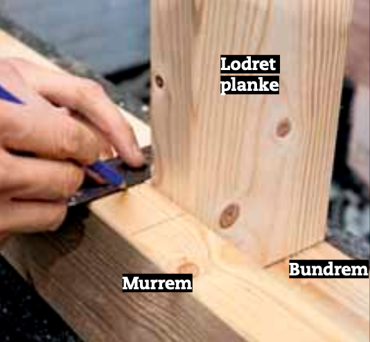 Inden du streger op og saver den skrå bundrem til i enden, lægges afstandsbrikker under. Bagefter markeres placeringen af de lodrette planker.