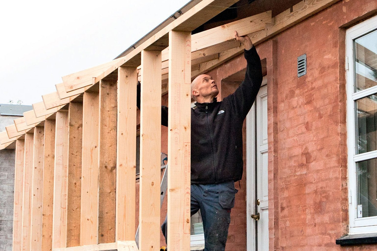 Spærene vil vi placere lige over de lodrette planker, fordi det giver det mest harmoniske udtryk, når linjerne i konstruktionen føres videre. Af samme grund bruger vi samme trædimension overalt i konstruktionen.