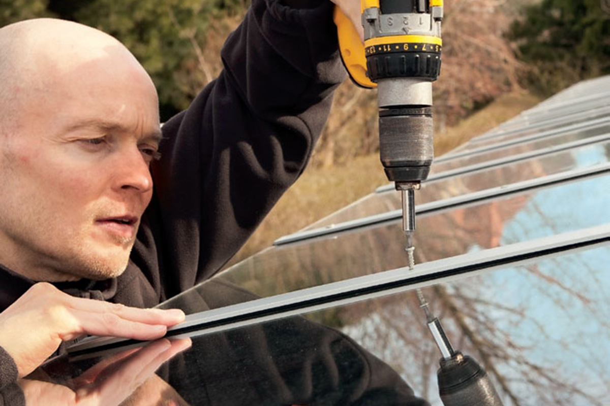Aluprofilet skrues fast i spæret, så det holder på glasset, der er spændt fast mellem to glasbånd af gummi. De sidder på toppen af spæret og på undersiden af alulisten.