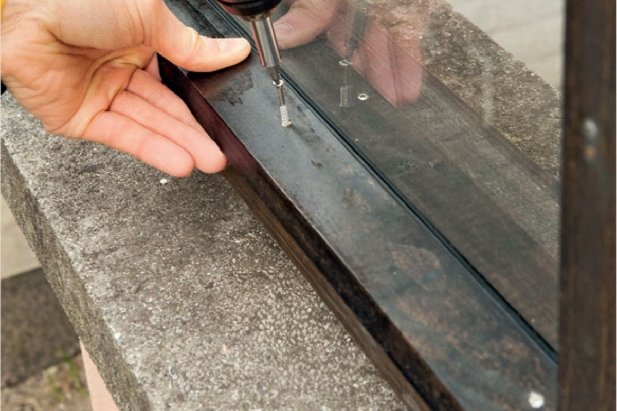 På alulisten, som holder ruderne fast, sætter vi et 2 x 8 mm glasbånd i hver side. Inden da har vi boret 6 mm huller i listen med et metalbor.