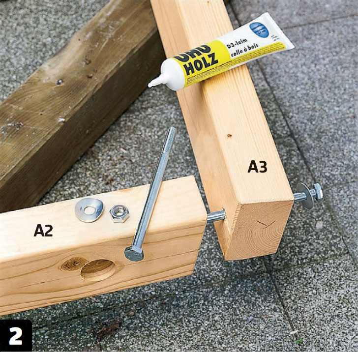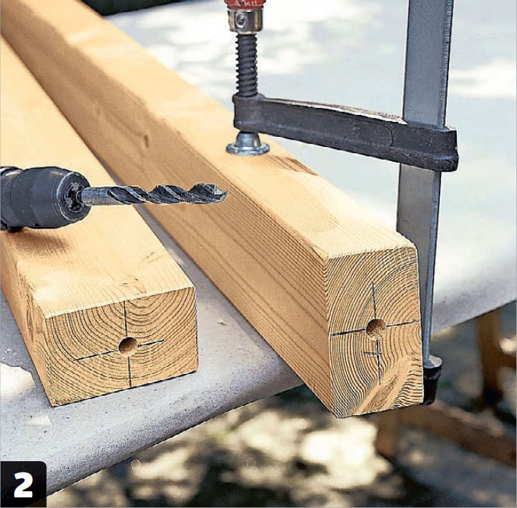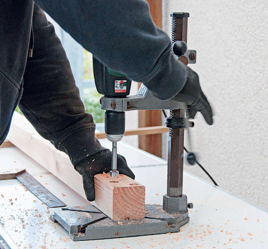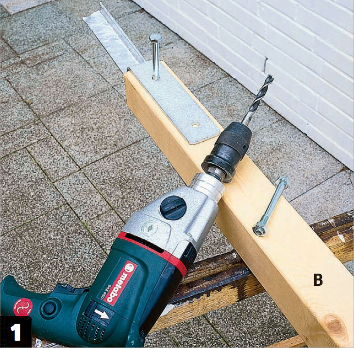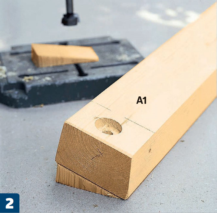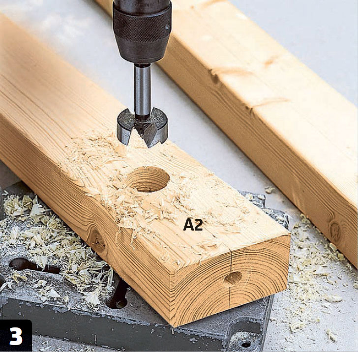 Læg kilen til rette under remmen (A1). Bor herefter, med en søjleboremaskine eller en boremaskine i en borestander, et hul i remmen med et 40 mm forstnerbor, så hullet får en vinkel, der passer til spæret (A2).