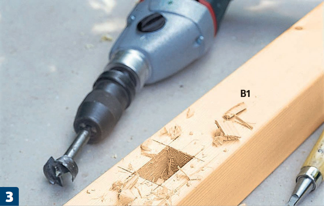 Mærk op til afstiveren (C) 200,2 cm oppe på stolpen (B1). Afstiveren måler 27 x 43 mm, og i stedet for at starte med stemmejernet kan du med fordel bore så meget træ ud som muligt med forstnerboret.