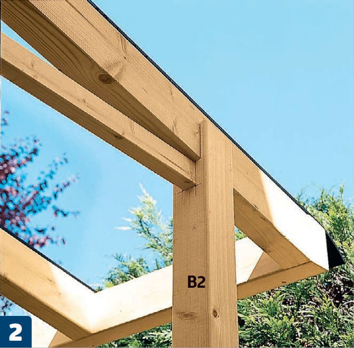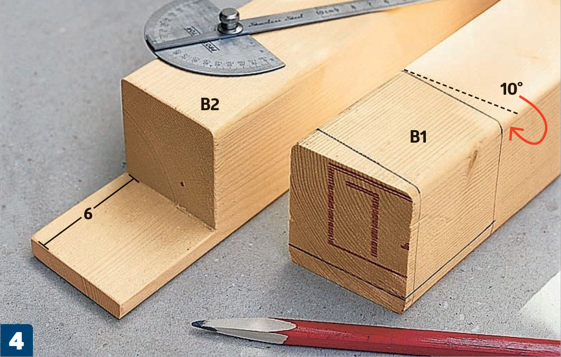 Markér en hældning på 10° på toppen af stolperne (B1 og B2), og skær dem til med en fukssvans. Hakket skal være 6 cm dybt. Hældningen gør, at spærene får den rette hældning.