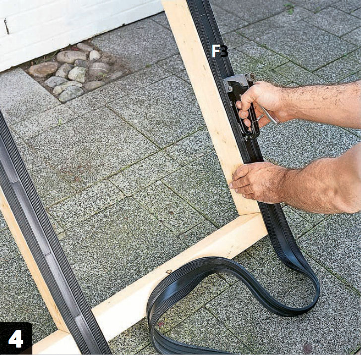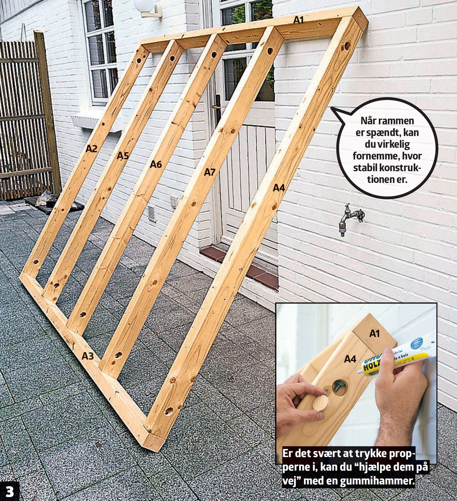 Herefter løftes selve rammen på plads. Her er det rigtig godt at være flere hænder, gerne to personer til at holde rammen på plads, mens en tredje spænder et par midlertidige støttelægter fast med et par tvinger, inden de forreste stolper (B2 og B3) monteres.