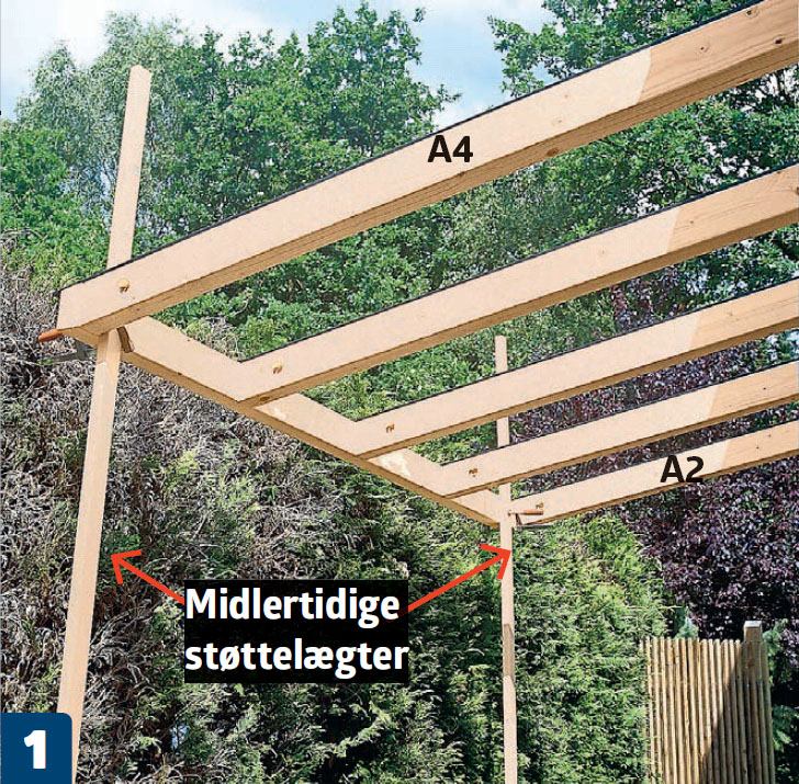 Løft rammen på plads med hjælp fra en ven, og montér to midlertidige lægter med tvinger, så konstruktionen kan holde sig svævende. Mærk op på spærene (A4 og A2), hvor stolperne (B3 og B2) skal stå.