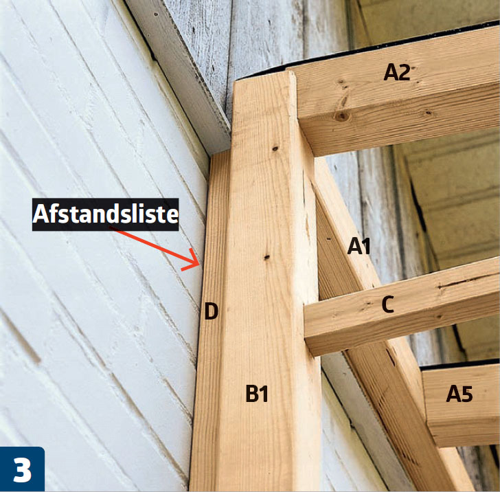 Skal du bygge en stor konstruktion, hvor vægten på taget kan blive høj, når det sner, er det en god idé at udstyre vindfanget med en afstiver (C). I vores tilfælde har vi valgt at skære og stemme ud til afstiveren og gøre plads til, at det yderste spær (A2) kan hvile ovenpå. Det giver stabilitet, samtidig med at udtrykket forbliver let og enkelt.