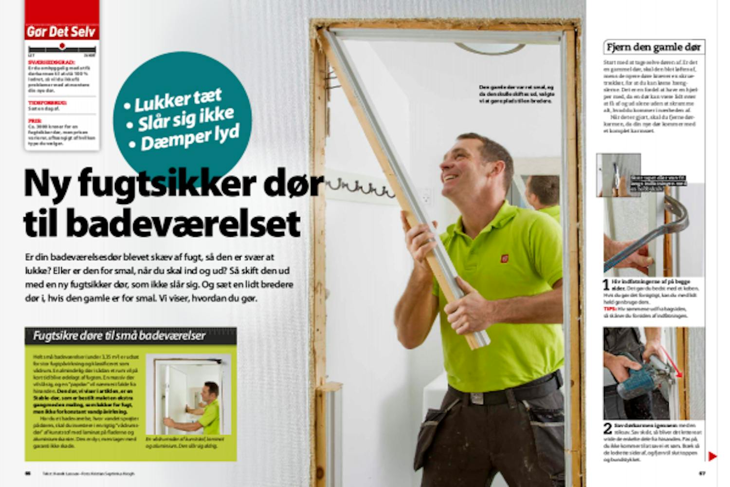 Start med at tage selve døren af. Er det en gammel dør, skal den blot løftes af, mens de nyere døre kræver en skruetrækker, for at du kan løsne hængslerne. Det er en fordel at have en hjælper med, da en dør kan være lidt svær at få af og ud alene uden at skramme alt, hvad du kommer i nærheden af.