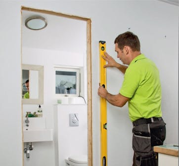 Når du monterer dørkarmen, skal du være helt sikker på, at bunden er 100 % vandret. Lav en opklodsning i bunden af dørhullet, inden du sætter karmen ind.