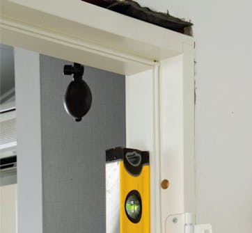 Dørkarmen skal være 100 % i lod. Brug et langt vaterpas, og ryk forsigtigt karmen på plads, til den er lodret i begge sider. Måske skal du løsne kiler eller windbags lidt for at kunne rykke på karmen.