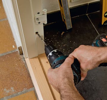 Bor for til monteringsskruerne. Her er der huller i selve karmen, så du skal blot bore ind i trækonstruktionen i væggen med et 6 mm bor.