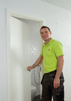 Indfatningen i badeværelset må ikke gå ned til gulvet på grund af fugten, så klods den op, inden du måler op og monterer den. Luk sprækken mod gulvet med elastisk fuge.