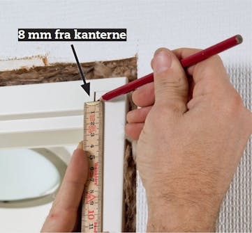 Start med at mærke af på karmen 8 mm fra den indvendige kant. Mærk af i top og langs siderne foroven, midtpå og forneden. Blyantsmærkerne skal du bruge, når du skal montere indfatningen, men også til at markere, hvor du skal save.