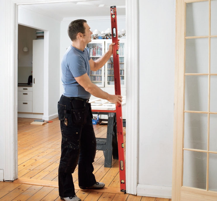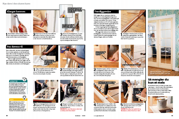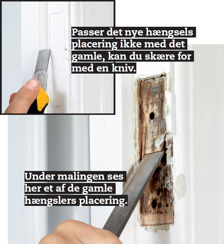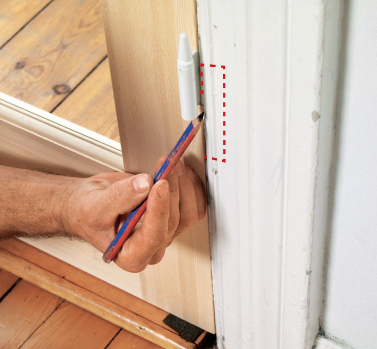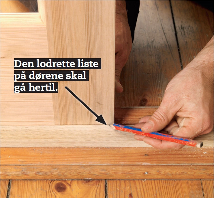 Start med at klodse den stående dør op i karmen, og tegn op, hvor hængslerne skal sidde. Den stående dør er den dør, der normalt ikke åbnes.