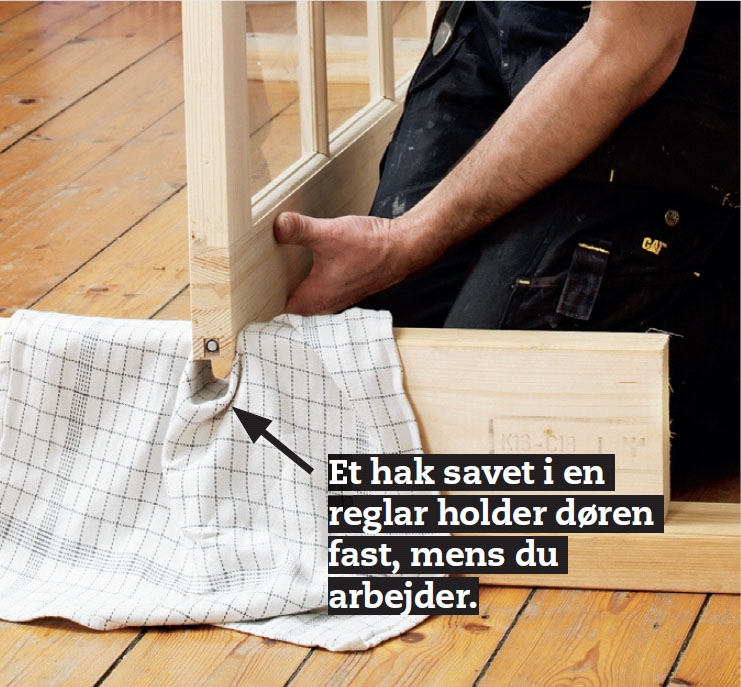 Læg et stykke stof over dørholderen, og pres den første dør ned i revnen. Nu står døren i spænd og vælter ikke, mens du arbejder med den.