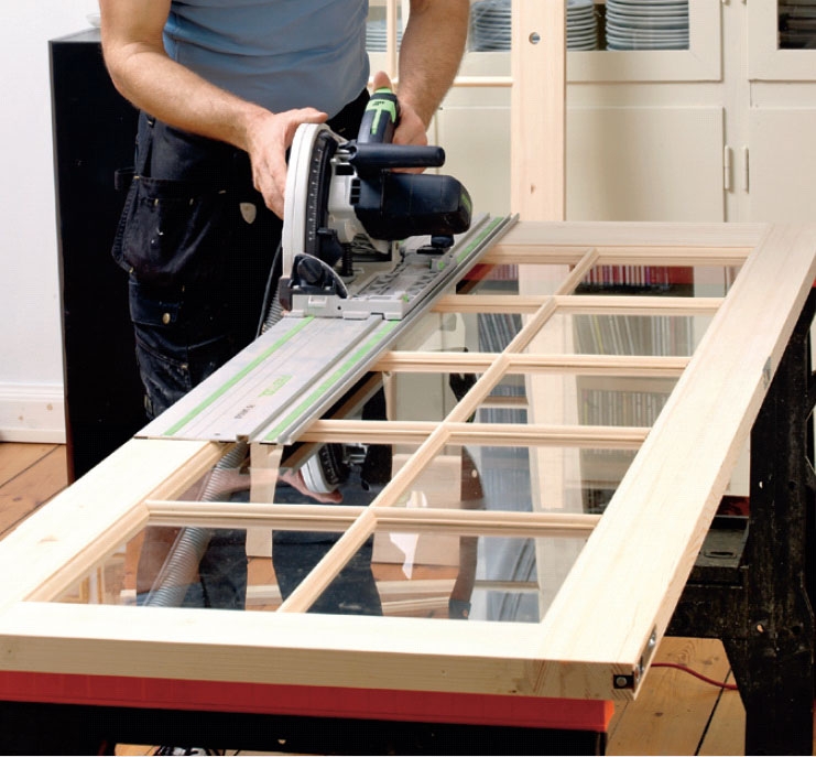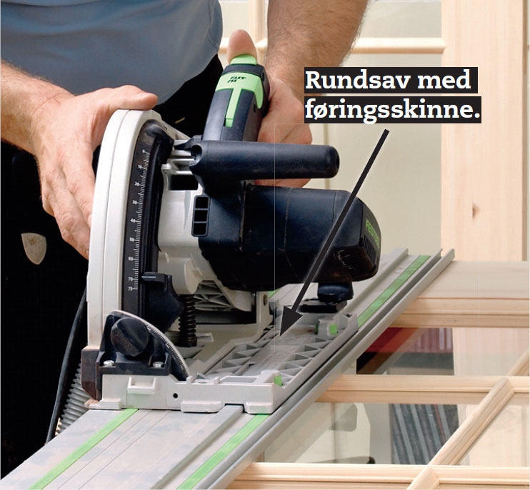 Sav nu hængselsiden til med et skråt snit. Her skal tages 8 mm af i toppen og ingenting i bunden (omvendt på den anden dør). Sav efter et lige bræt eller som her en føringsskinne.