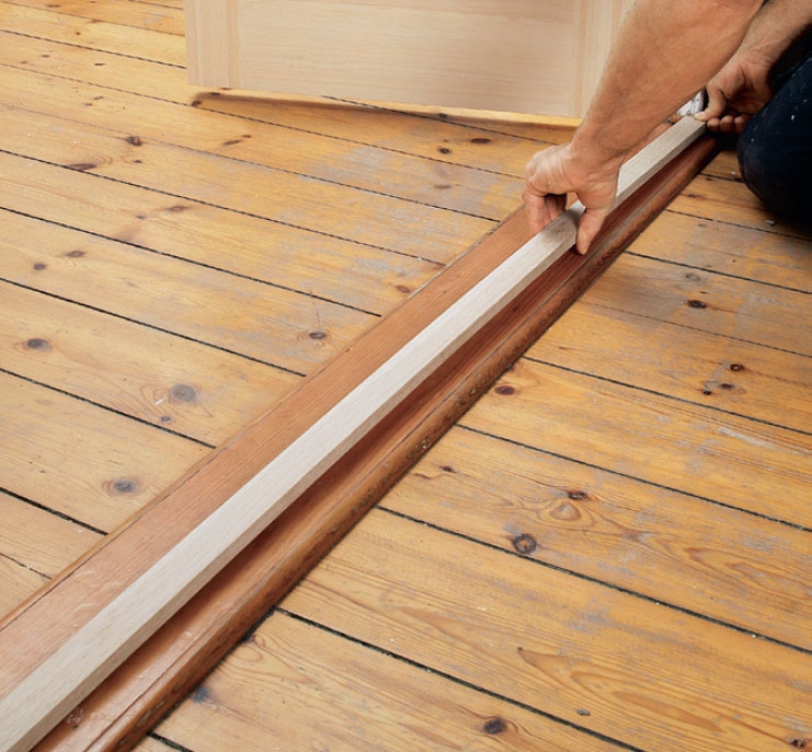 Når begge døre er monteret, skal du sørge for en ordentlig afslutning i bunden. Lav fx en anslagsliste, som stiftes på et bræt, som skiller de to stuer. Vi har valgt at montere en 15 x 35 mm egetræsliste, der med lidt bejdse og lidt lak nemt kommer til at ligne de gamle gulve.