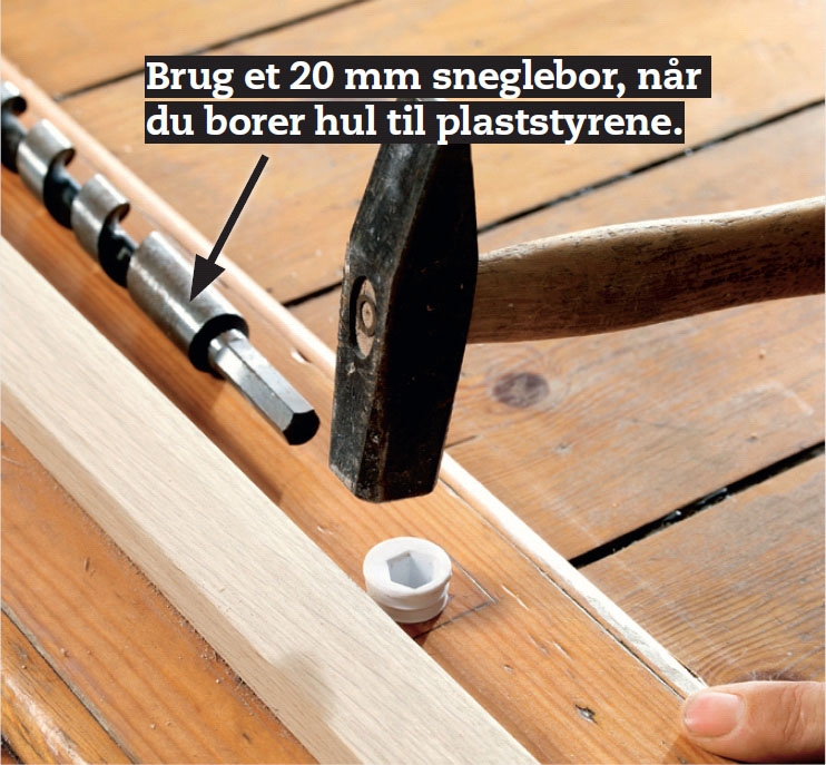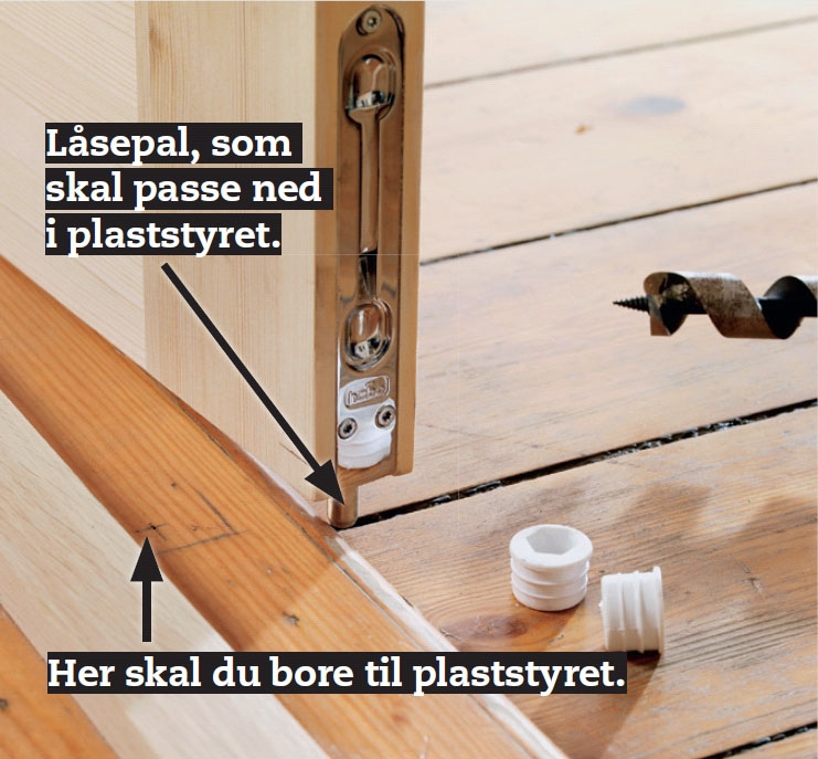 Mærk af til plaststyrene, som skal holde låsepalerne (paskvilerne) i top og bund. Streg enden af den stående dør op, så du har noget at måle ud fra. Bor hul til styrene med et 20 mm sneglebor.