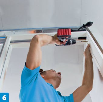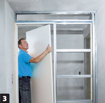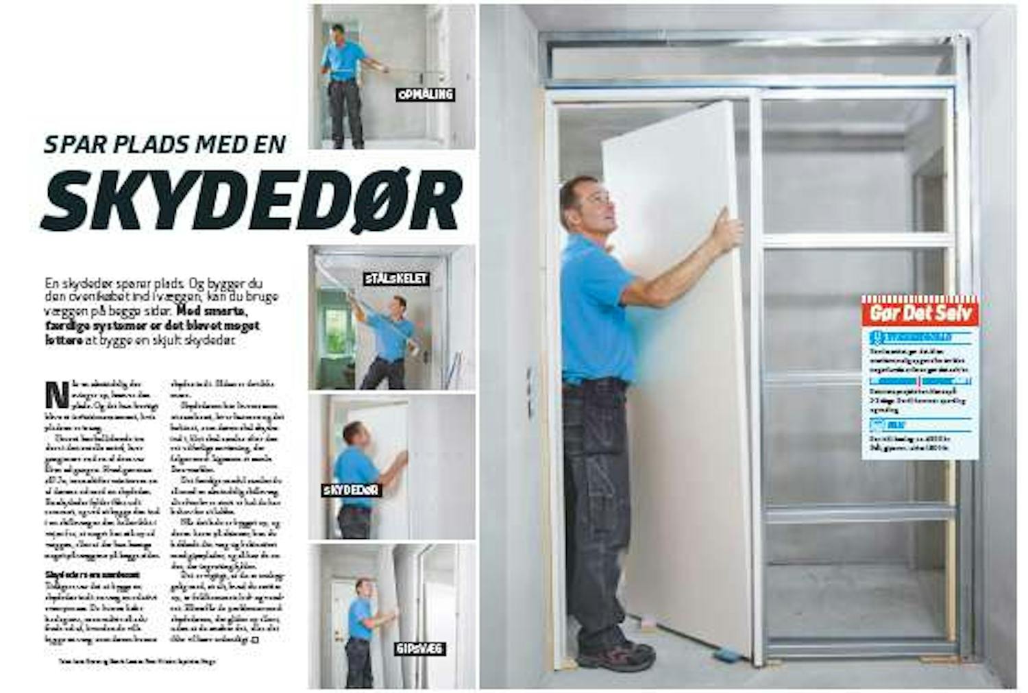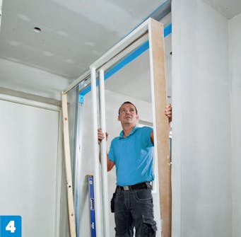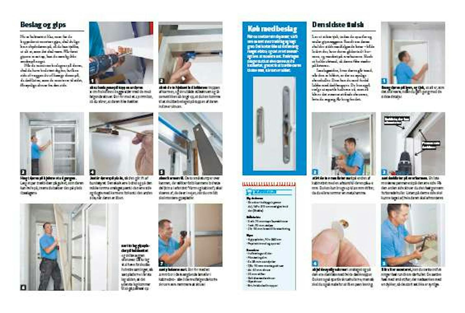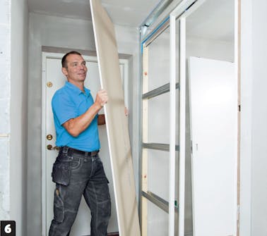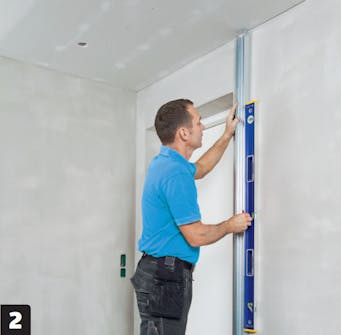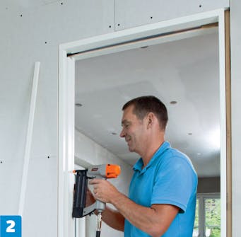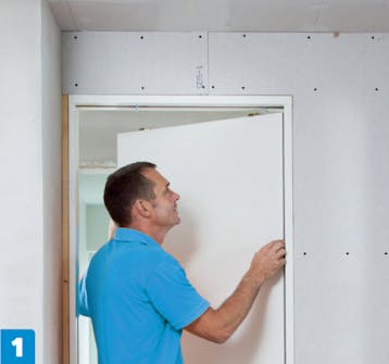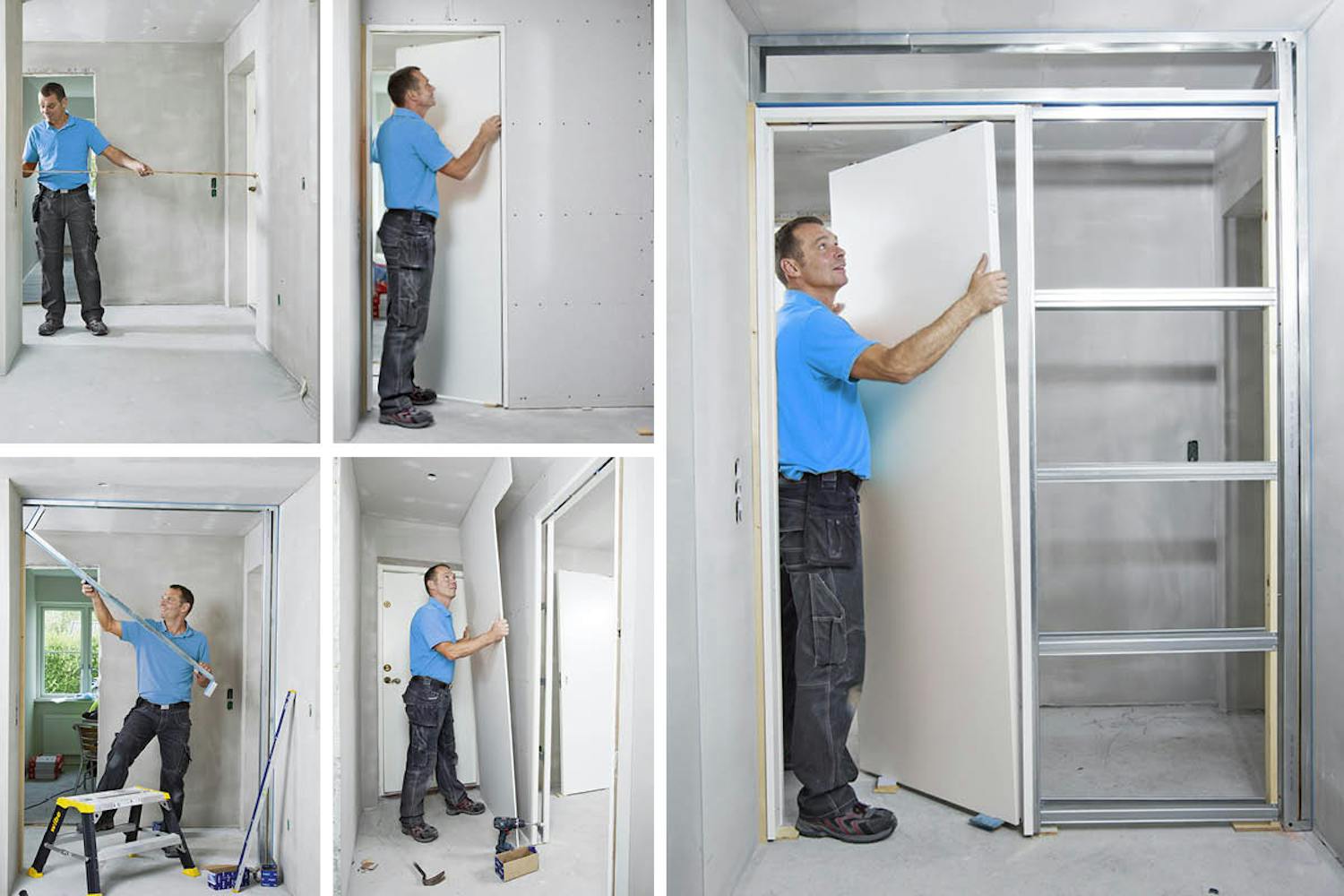 Lav et sidste tjek, inden du spartler og maler gipsvæggene. Rundt om døren skal der sidde medfølgende lister - både lodret der, hvor døren glider ind i karmen, og vandret på overkarmen. Husk at holde afstand, så døren ikke støder på listerne.