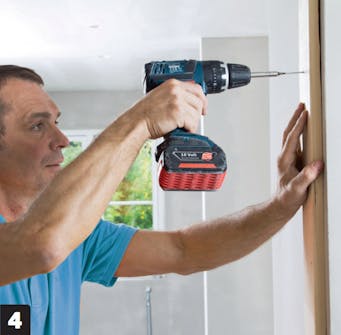 Hvis du har gipsvægge, kan du som her skrue et forskallingsbræt fast til væggen. Ud over skruer får det et solidt lag monteringslim, så det sidder fast.