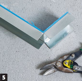 Klip kantskinnen til. Klip kun i sideflangerne, og lav ombuk. Så er der mere styr på dem. En god pladesaks er et must, når du skal arbejde med stål.