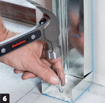 Kom en lægte ind i lodstolpen. Stolpen står så tæt på væggen, at det er nødt til at ske, inden stolpen sættes på plads. Lægten er til at skrue karmen fast i, da stålet ikke er stærkt nok.