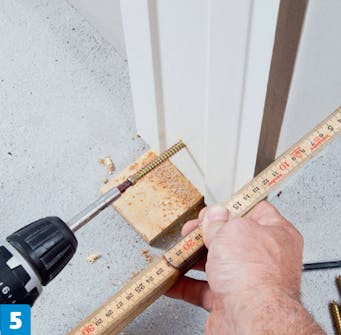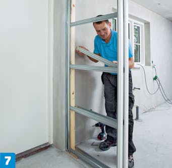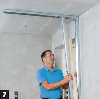 Mål grundigt op, og find ud af, hvordan skydedøren placeres bedst. Hvis dine vægge er af gips, er det en god idé at forstærke dem med træ, som vi gør her, da gipsen ikke kan holde fast på en skrue, når døren belaster den. Træet vil blive skjult af kabinettet.