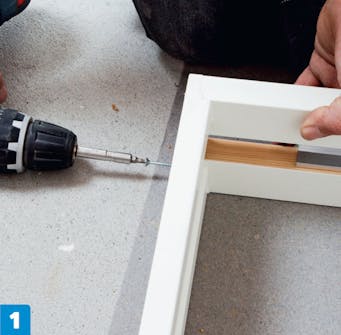 Skru karmens side- og overstykke sammen. Bor for, og giv også samlingen lidt snedkerlim, så den bliver ekstra stærk.