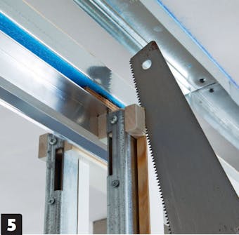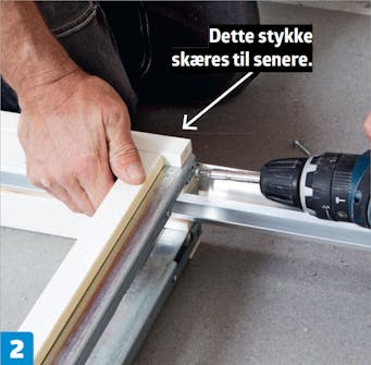 Skær karmen til. De to små stumper over karmen, der stikker forbi karmens lodrette del (trin 2 i afsnittet “Karm og kabinet”), skal skæres af, da de er i vejen, når du om lidt skal montere gipsplader.