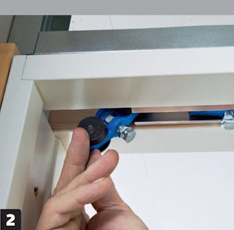Skub de to hjulsæt ind i skinnen i toppen af karmen, og skru både stilleskruen og låsemøtrikken så langt op, at du kan komme til at skubbe beslaget på toppen af døren ind over skruen.