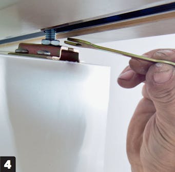 Stift de to 9 mm lister fast på enden af kabinettet med en afstand til døren på 4-5 mm. Du kan kun bruge op til 25 mm stifter, da du ellers rammer en metalramme.