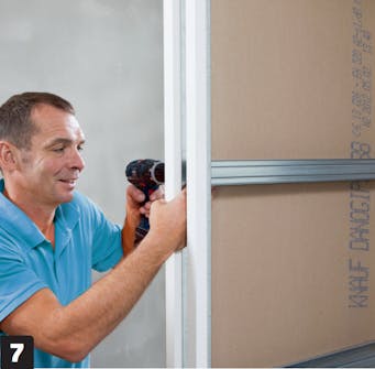 Nu er kabinettet klar, men før du begynder at montere gips, skal du lige have skydedøren på, så du kan tjekke, at alt er, som det skal være. Når først gipsen er sat op, kan du nemlig ikke ændre på noget.