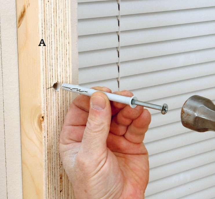 Bor for, og slå 8 x 80 mm karmdyvler i. Karmdyvlerne holder godt fast i beton, mursten og letbeton. Bor både for i lægte og ind i væggen med et langt 8 mm bor.