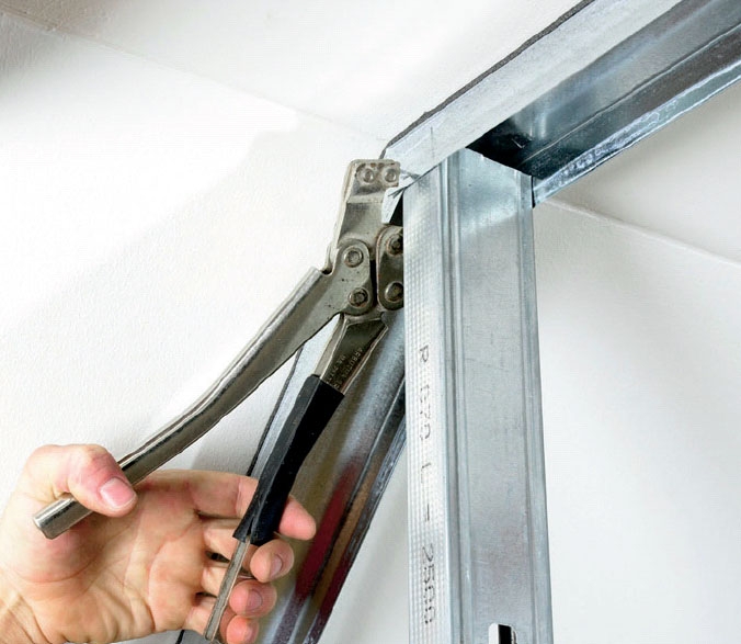 Skru føringsskinnen op i bunden af lægten. Det er vigtigt, at skinnen sidder midt i hulrummet mellem de to sider. Da hulrummet er 7 cm, skal der være 3,5 cm til midten af skinnen.