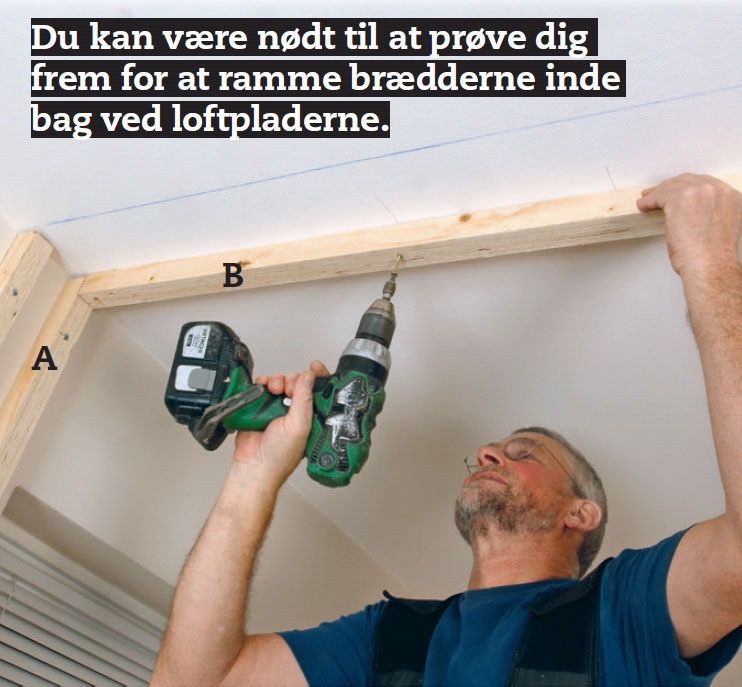 Skru lægterne fast i loftet. Hold de to lægter (B) til stregerne på loftet, og gør dem fast med 5 x 80 mm skruer. Et glat gipsloft som her er oftest monteret på brædder med 30 eller 40 cm mellemrum.