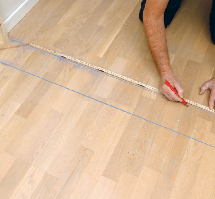 Når de vandrette lægter er skruet fast, kommer turen til de lodrette. Dem skærer vi først til, så de passer i højden. De skal stå med samme afstand i hele væggens længde. For at sikre, at de står i lod, mærker vi først op på lægterne på gulvet og bruger så en lægte og et vaterpas til at sikre, at stregerne på loftet ender rigtigt.