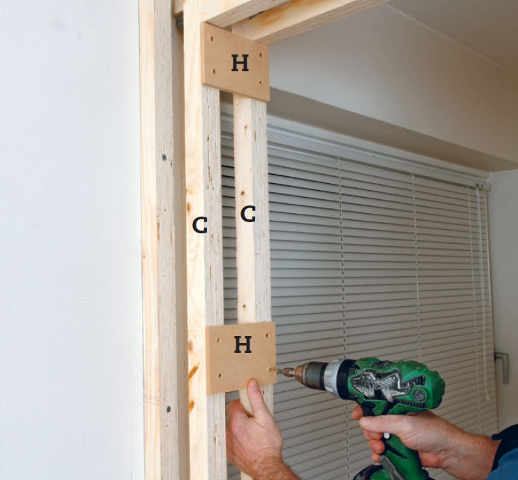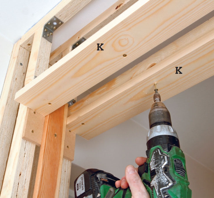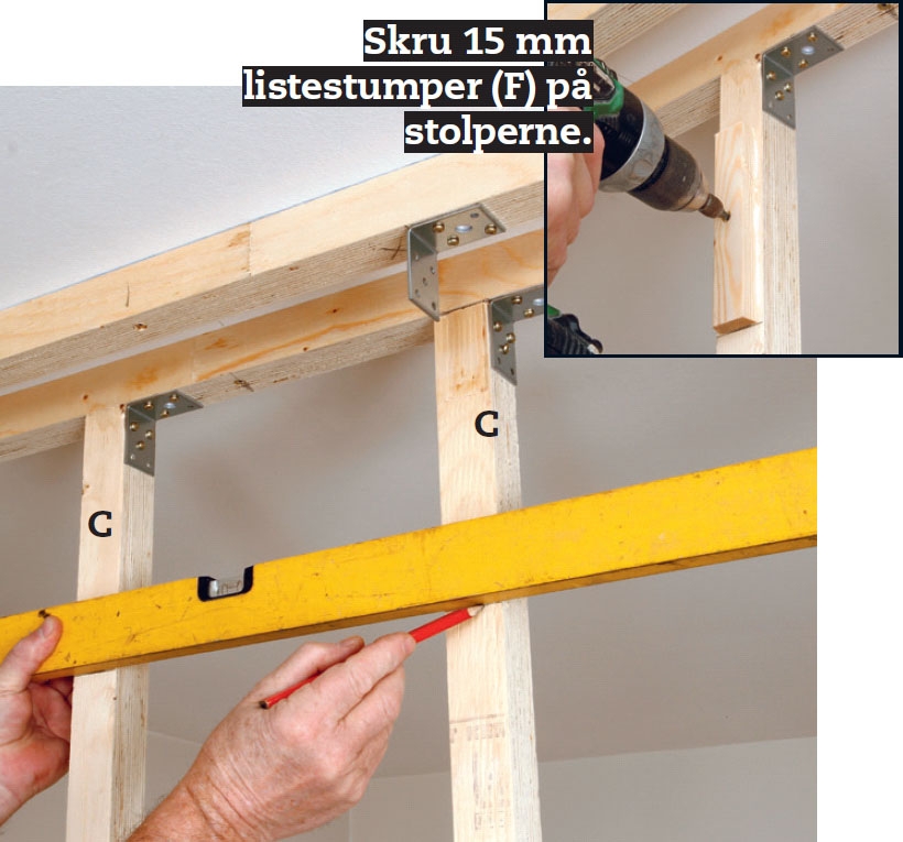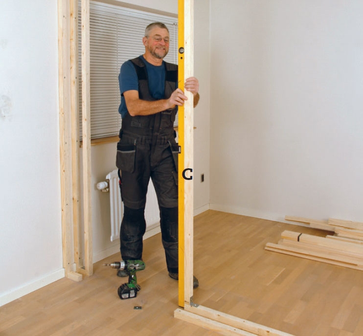 Sæt to stolper (C ) i spænd mellem gulv og loft. Placer dem på begge sider af døråbningen. Ret dem ind i lod, og skru dem fast til lægterne på gulvet med vinkelbeslag og 4 x 30 mm skruer.