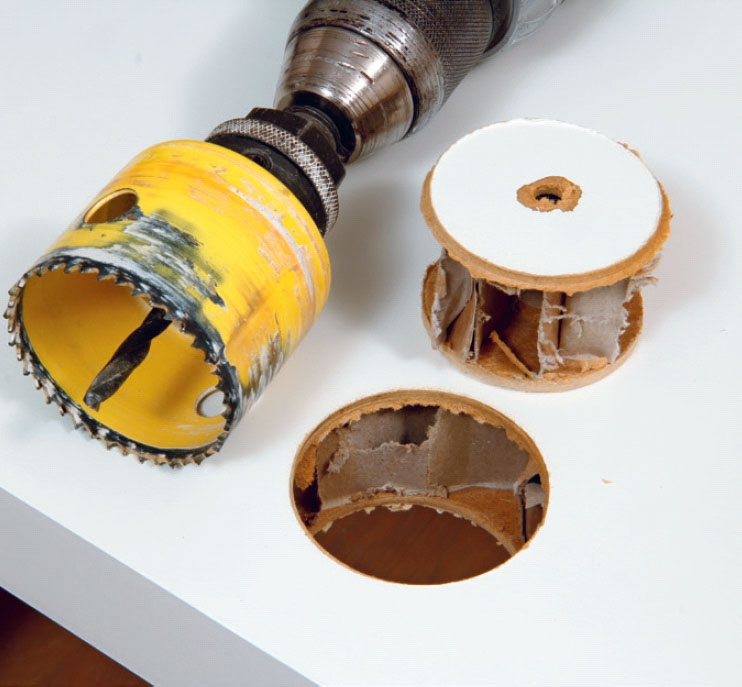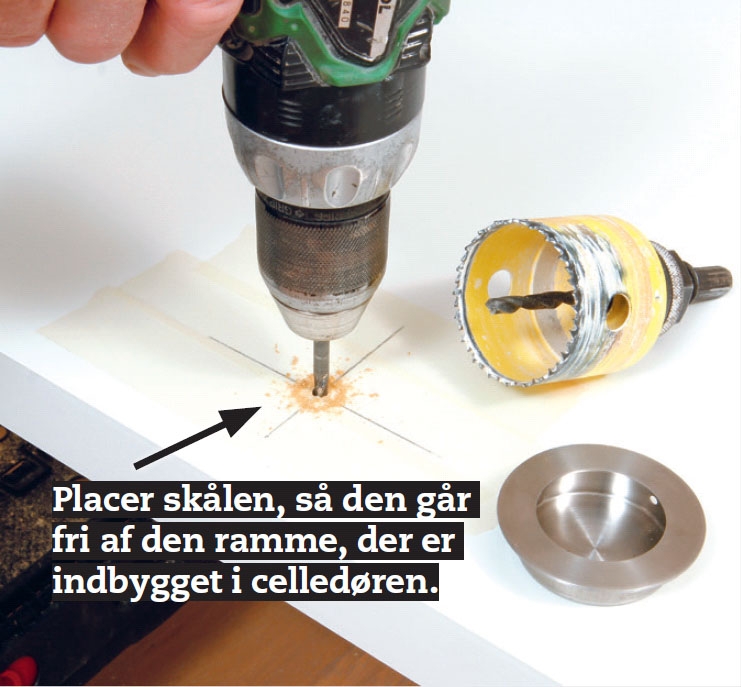 Bor med hulsaven fra begge sider. Vælg en hulsav, der er lidt større end den ”dybe” del af skydedørsskålen. Start forsigtigt med få omdrejninger, så hulsaven ikke løber løbsk og laver et stort hul.