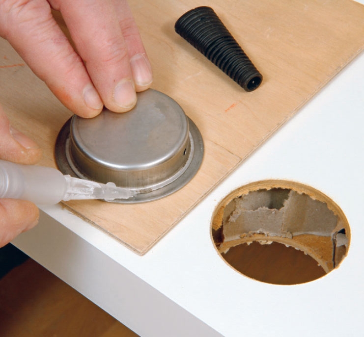 Lim skålen fast. Rengør kanten på skydedørsskålen for fedt og snavs. Kom sekundlim hurtigt på kanten hele vejen rundt. Placer straks skydedørsskålen i hullet, og tryk den fast i cirka et minut.