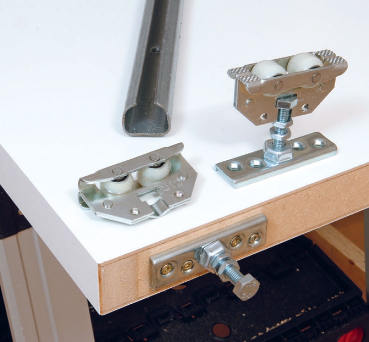 I toppen af døren skal der skrues rullebeslag fast, så døren kan hænges op på en skinne og rulle frem og tilbage.