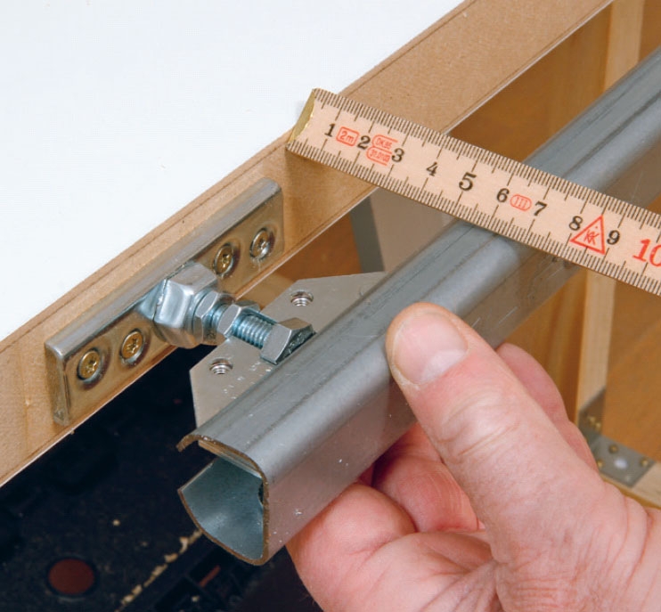 Juster beslaget. Skru bolten i “middel dybde”. Sæt skinnen med rulledelen på bolten. Træk skinnen længst muligt tilbage, og mål fra overkanten af dørpladen. Der skal være 7 cm til overkanten af skinnen.