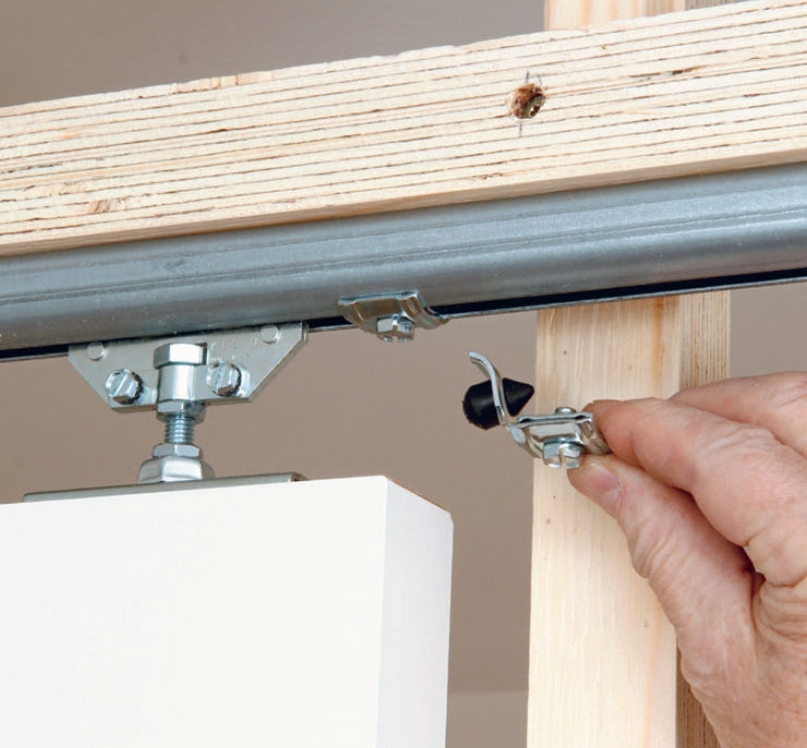 Skub to rullebeslag ind i skinnen. Monter bolten i dørens beslag i rullebeslaget. Juster beslagene, til døren hænger lodret i den rigtige højde. Spænd kontramøtrikkerne.